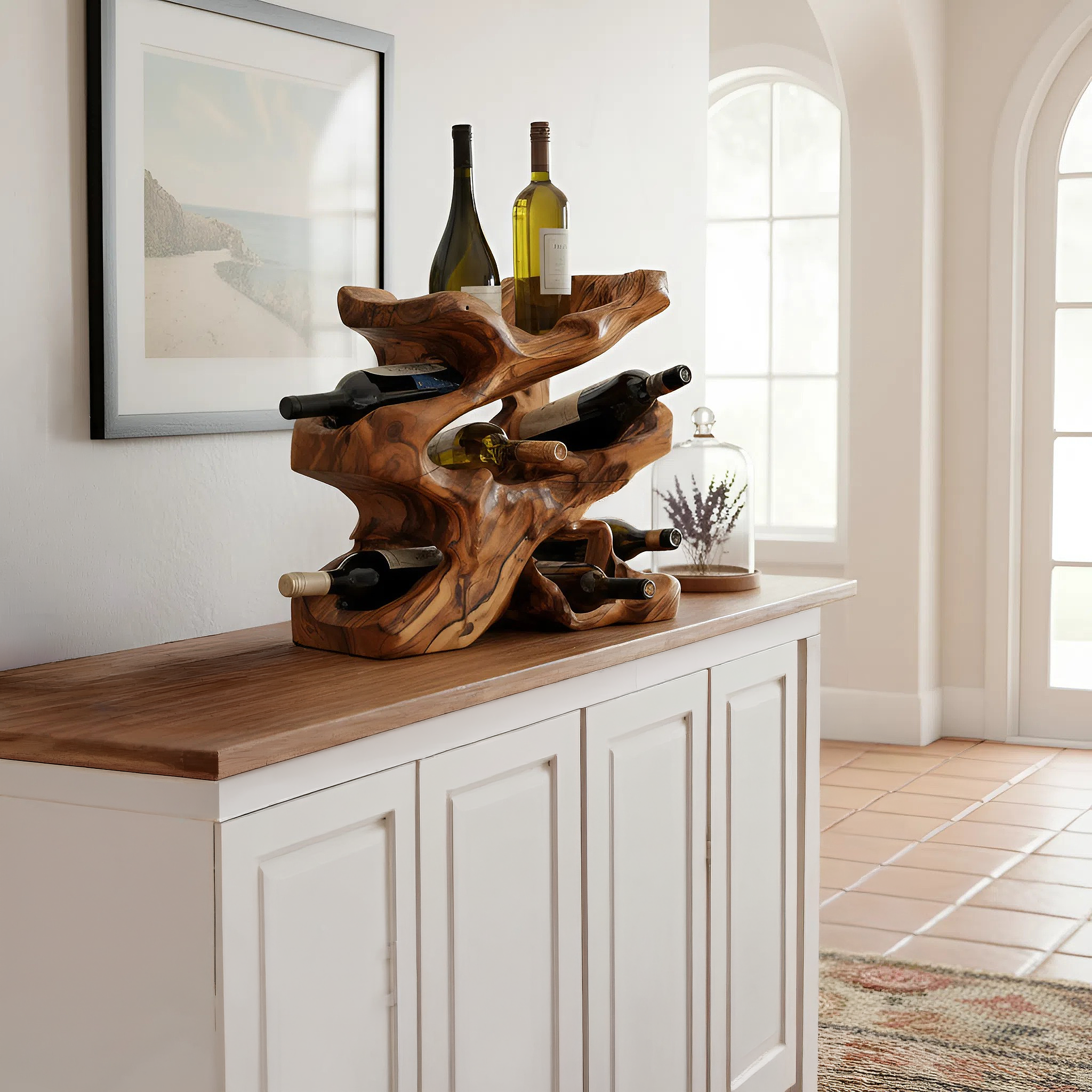 Designed with a fluid, free-flowing profile, this wine rack highlights soft curves and open carved spaces that create a sense of movement and visual lightness. The sculptural form allows each bottle to become part of the overall composition, giving the piece a dynamic yet balanced presence. As both a storage solution and a statement accent, it adds depth, artistry, and refined character to interiors that value thoughtful design.