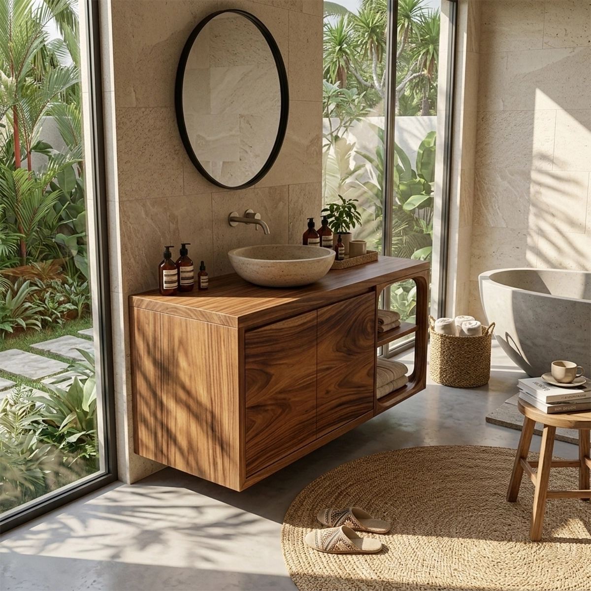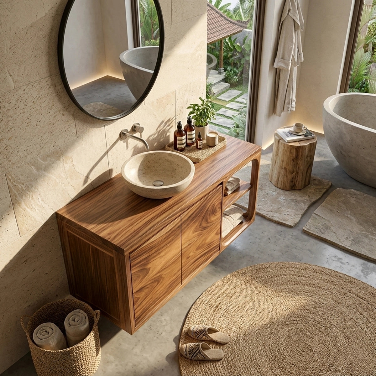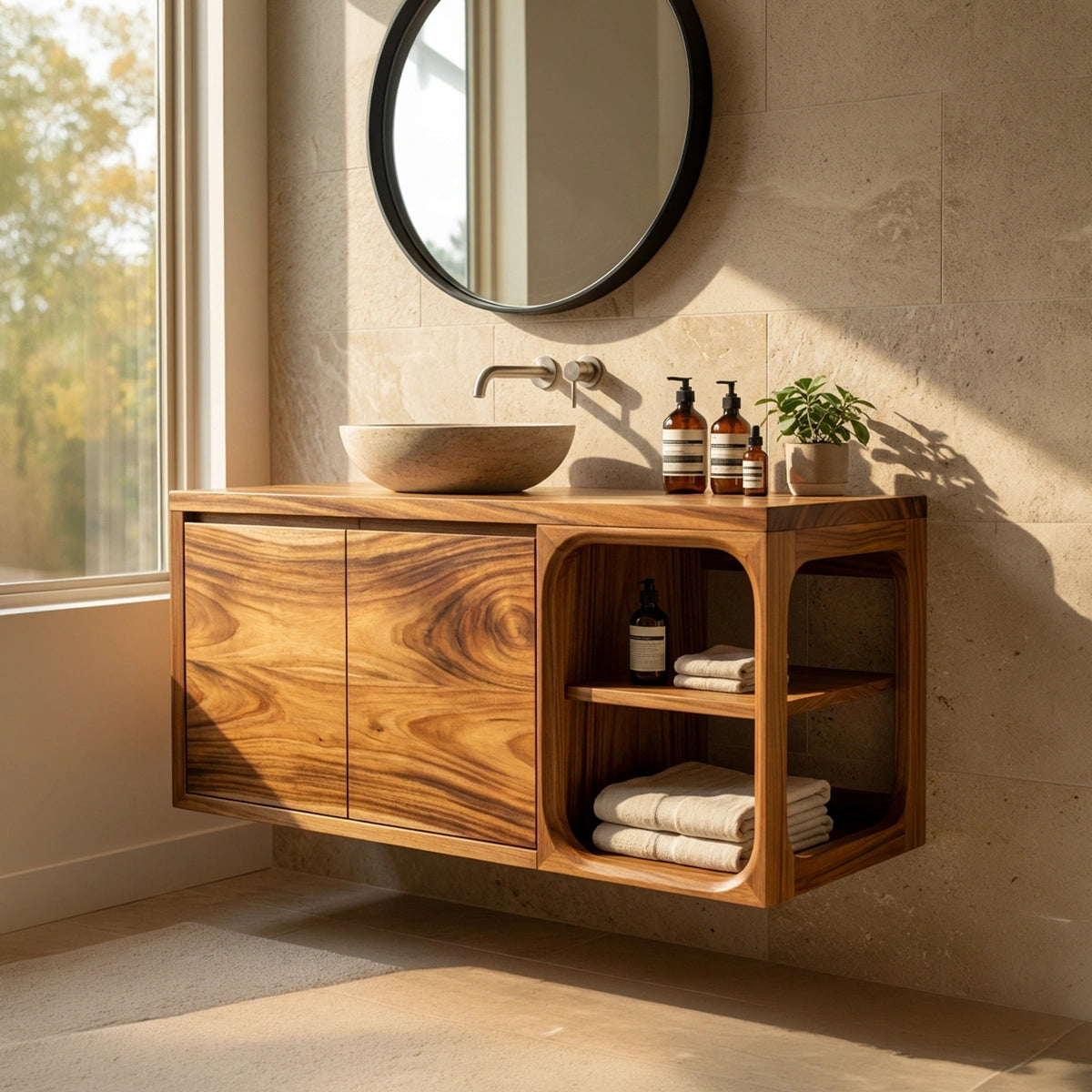 Handcrafted from natural wood, each vanity is carefully shaped and hand-finished to highlight the richness of the grain, tonal variation, and authentic texture of the material. The smooth surfaces enhance the depth and movement within the wood, while the sculpted open shelf frame adds another layer of handcrafted detail. These natural features ensure that every piece carries its own distinct beauty and individuality.