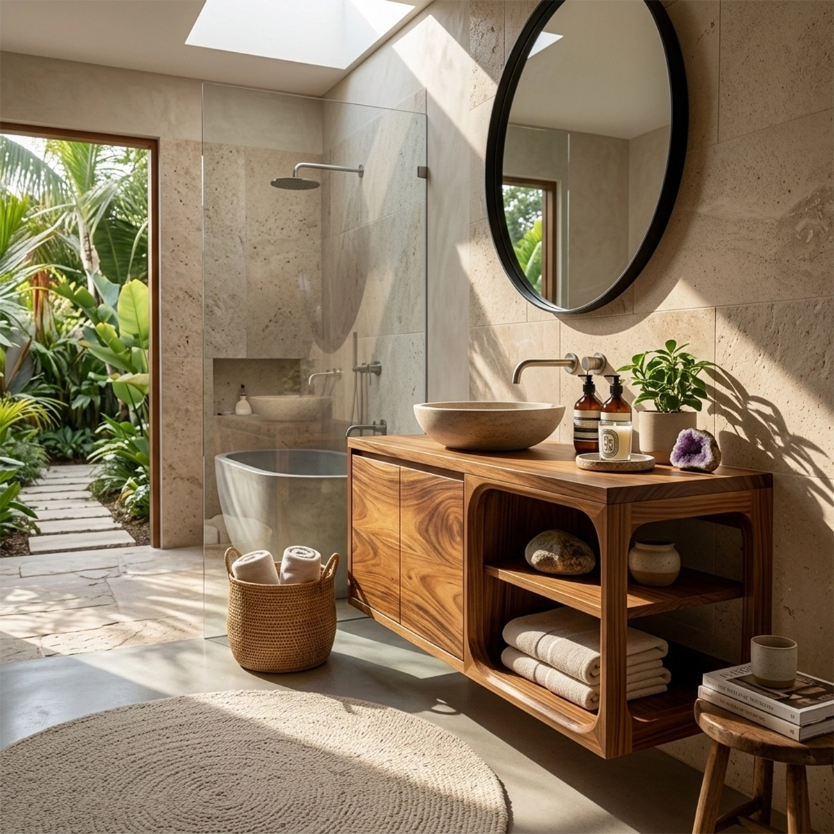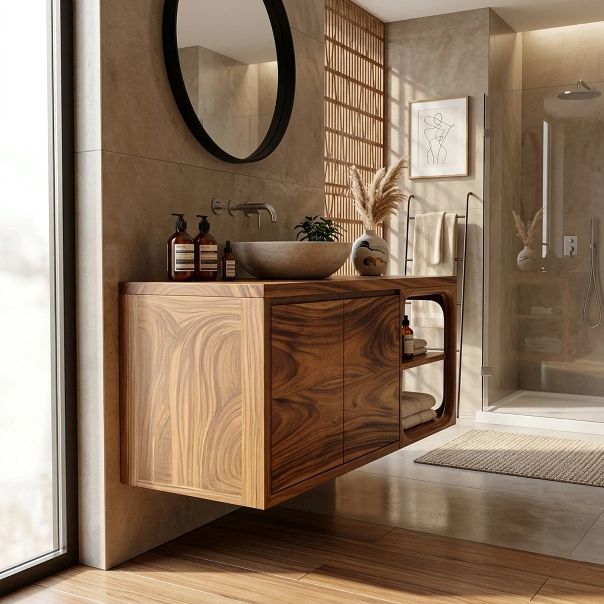 - Open shelf for towels, baskets, or daily essentials