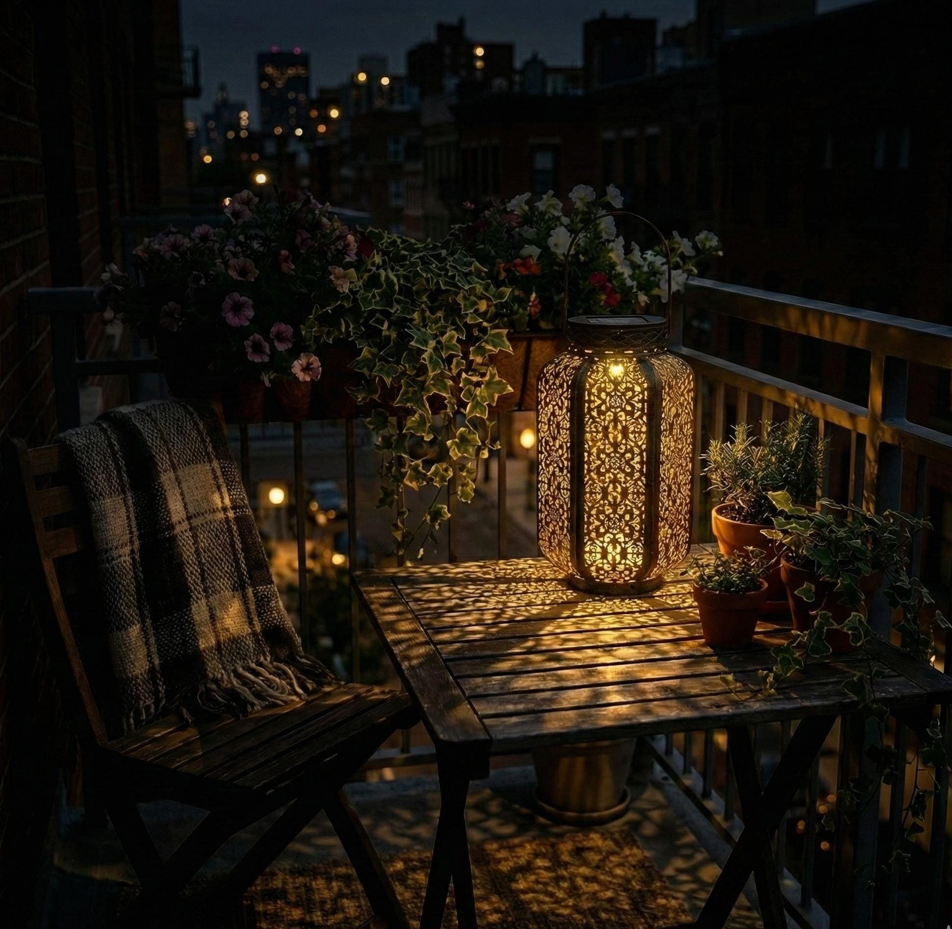 The intricate cut-out design projects magical light patterns on the ground at night, turning your garden or balcony into a charming escape.